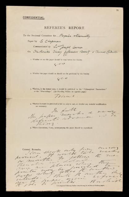 John William Strutt, Referee's report by John William Strutt, Lord Rayleigh on a paper 'On the kinetic theory of a gas. Part II - A composite monatomic gas: diffusion, viscosity, and thermal conduction' by S Chapman, October 1915, RR/22/33, The Royal Society Archives, London, https://makingscience.royalsociety.org/items/rr_22_33/referees-report-by-john-william-strutt-lord-rayleigh-on-a-paper-on-the-kinetic-theory-of-a-gas-part-ii-a-composite-monatomic-gas-diffusion-viscosity-and-thermal-conduction-by-s-chapman, accessed on 06 December 2025