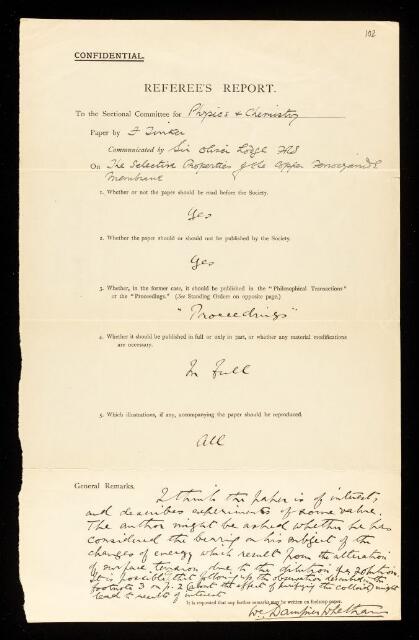 Referee's report by W D Whetham, on a paper 'The selective properties of the copper ferrocyanide membrane' by Frank Tinker, March 1917, RR/23/102, The Royal Society Archives, London, https://makingscience.royalsociety.org/items/rr_23_102/referees-report-by-w-d-whetham-on-a-paper-the-selective-properties-of-the-copper-ferrocyanide-membrane-by-frank-tinker, accessed on 11 November 2025