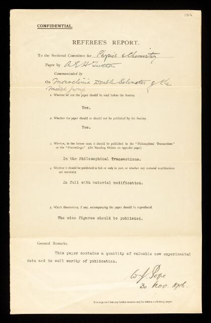 William Jackson Pope, Referee's report by William Jackson Pope, on a paper 'Monoclinic double selenates of the nickel group' by Alfred Edwin Howard Tutton, 30 November 1916, RR/23/104, The Royal Society Archives, London, https://makingscience.royalsociety.org/items/rr_23_104/referees-report-by-william-jackson-pope-on-a-paper-monoclinic-double-selenates-of-the-nickel-group-by-alfred-edwin-howard-tutton, accessed on 09 November 2025