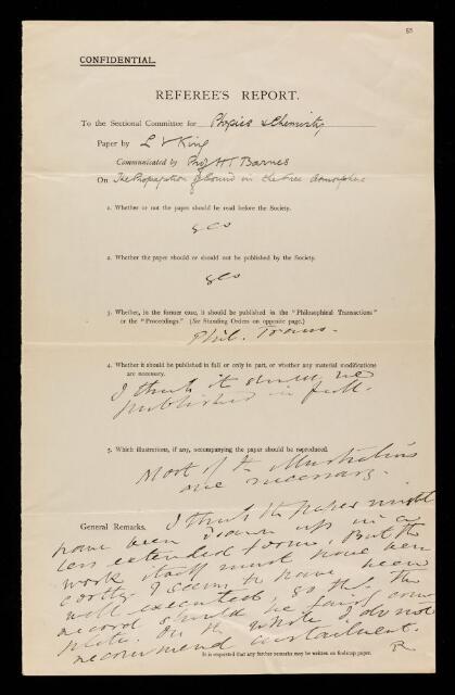 Referee's report by Edwin Henry Barton, on a paper 'On the propagation of sound in the free atmosphere and the acoustic efficiency of fog-signal machinery: an account of experiments carried out at father point, quebec, September, 1913' by Louis Vessot King