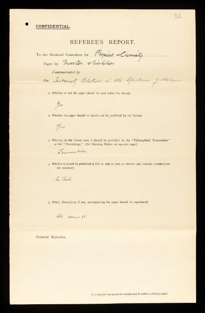 Arthur Schuster, Referee's report by Arthur Schuster, on a paper 'On intensity relations in the spectrum of helium' by Thomas Ralph Merton and John William Nicholson, 1918, RR/25/32, The Royal Society Archives, London, https://makingscience.royalsociety.org/items/rr_25_32/referees-report-by-arthur-schuster-on-a-paper-on-intensity-relations-in-the-spectrum-of-helium-by-thomas-ralph-merton-and-john-william-nicholson, accessed on 16 November 2025
