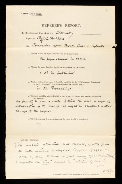 Harold Baily Dixon, Referee's report by Harold Baily Dixon, on a paper 'Researches upon brown coals and ignites. Part I.— Heat treatment at temperatures below 400° C. as a possible method for enhancing their fuel values' by William Arthur Bone, February 1921, RR/26/13, The Royal Society Archives, London, https://makingscience.royalsociety.org/items/rr_26_13/referees-report-by-harold-baily-dixon-on-a-paper-researches-upon-brown-coals-and-ignites-part-i-heat-treatment-at-temperatures-below-400-c-as-a-possible-method-for-enhancing-their-fuel-values-by-william-arthur-bone, accessed on 08 March 2026