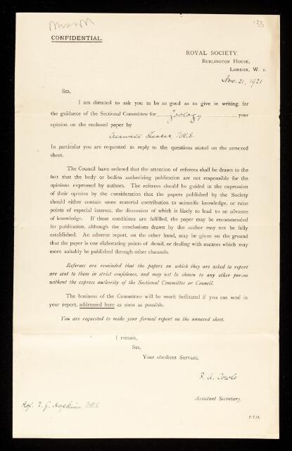 Frederick Gowland Hopkins, Referee's report by Frederick Gowland Hopkins, on a paper 'On the oxidation processes of the echinoderm egg during fertilisation' by Cresswell Shearer, January 1922, RR/26/133, The Royal Society Archives, London, https://makingscience.royalsociety.org/items/rr_26_133/referees-report-by-frederick-gowland-hopkins-on-a-paper-on-the-oxidation-processes-of-the-echinoderm-egg-during-fertilisation-by-cresswell-shearer, accessed on 09 February 2026