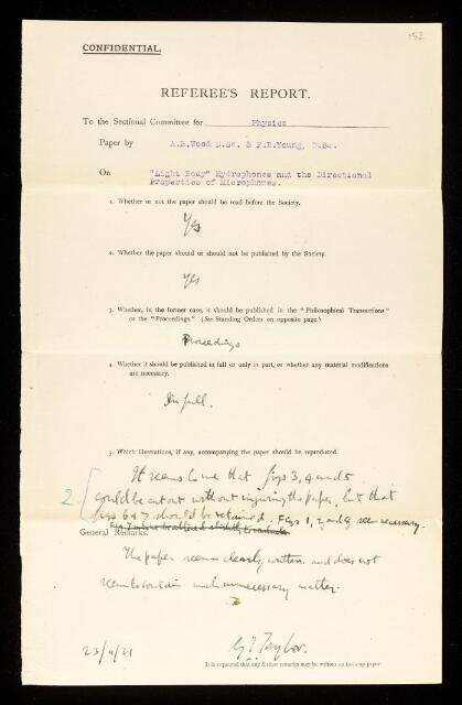 Geoffrey Ingram Taylor, Referee's report by Geoffrey Ingram Taylor, on a paper 'On “light body” hydrophones and the directional properties of microphones' by A B Wood and F B Young, 23 April 1921, RR/26/152, The Royal Society Archives, London, https://makingscience.royalsociety.org/items/rr_26_152/referees-report-by-geoffrey-ingram-taylor-on-a-paper-on-light-body-hydrophones-and-the-directional-properties-of-microphones-by-a-b-wood-and-f-b-young, accessed on 21 January 2026