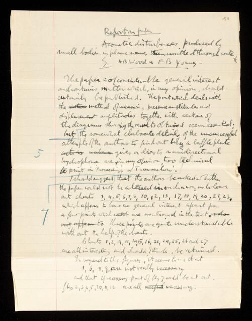 Geoffrey Ingram Taylor, Referee's report by Geoffrey Ingram Taylor, on a paper 'On the acoustic disturbances produced by small bodies in plane waves transmitted through water, with special reference to the single-plate direction finder' by A B Wood and F B Young, April 1921, RR/26/154, The Royal Society Archives, London, https://makingscience.royalsociety.org/items/rr_26_154/referees-report-by-geoffrey-ingram-taylor-on-a-paper-on-the-acoustic-disturbances-produced-by-small-bodies-in-plane-waves-transmitted-through-water-with-special-reference-to-the-single-plate-direction-finder-by-a-b-wood-and-f-b-young, accessed on 21 January 2026