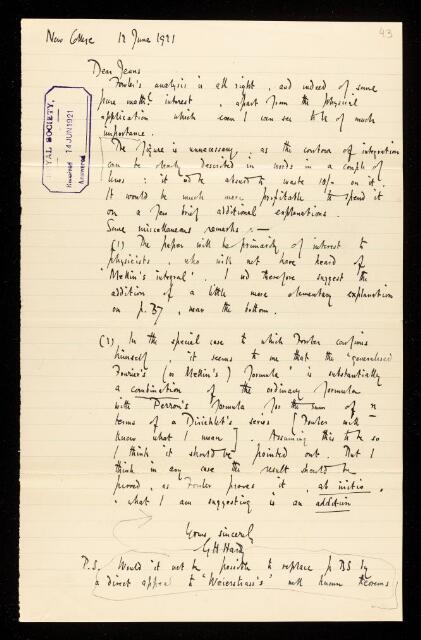Godfrey Harold Hardy, Referee's report by Godfrey Harold Hardy, on a paper 'A simple extension of Fourier's integral theorem and some physical applications, in particular to the theory of quanta' by Ralph Howard Fowler, 12 June 1921, RR/26/43, The Royal Society Archives, London, https://makingscience.royalsociety.org/items/rr_26_43/referees-report-by-godfrey-harold-hardy-on-a-paper-a-simple-extension-of-fouriers-integral-theorem-and-some-physical-applications-in-particular-to-the-theory-of-quanta-by-ralph-howard-fowler, accessed on 25 January 2026