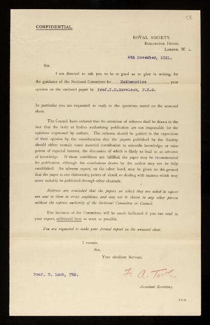 Horace Lamb, Referee's report by Horace Lamb, on a paper 'The effect of shallow water on wave resistance' by Thomas Henry Havelock, November 1921, RR/26/58, The Royal Society Archives, London, https://makingscience.royalsociety.org/items/rr_26_58/referees-report-by-horace-lamb-on-a-paper-the-effect-of-shallow-water-on-wave-resistance-by-thomas-henry-havelock, accessed on 05 December 2025