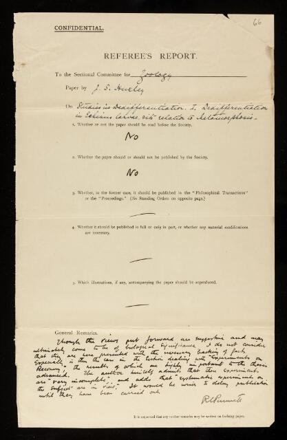 Reginald Crundall Punnett, Referee's report by Reginald Crundall Punnett, on a paper 'Studies in dedifferentiation I - Dedifferentiation in Echinus larvae, and it's relation to metamorphosis' by Julian Sorell Huxley, November 1921, RR/26/66, The Royal Society Archives, London, https://makingscience.royalsociety.org/items/rr_26_66/referees-report-by-reginald-crundall-punnett-on-a-paper-studies-in-dedifferentiation-i-dedifferentiation-in-echinus-larvae-and-its-relation-to-metamorphosis-by-julian-sorell-huxley, accessed on 09 December 2025