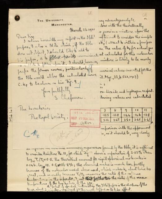 Sydney Chapman, Referee's report by Syndey Chapman, on a paper 'Some experiments on thermal diffusion' by T L Ibbs, 26 March 1921, RR/26/68, The Royal Society Archives, London, https://makingscience.royalsociety.org/items/rr_26_68/referees-report-by-syndey-chapman-on-a-paper-some-experiments-on-thermal-diffusion-by-t-l-ibbs, accessed on 09 December 2025