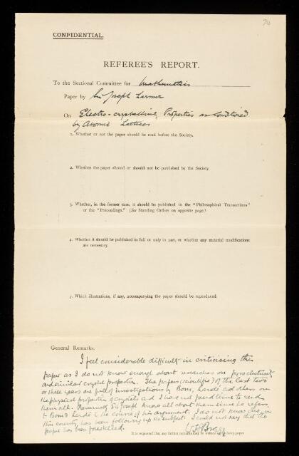 William Henry Bragg, Referee's report by William Henry Bragg, on a paper 'On electro-crystalline properties as conditioned by atomic lattices' by Joseph Larmor, February 1921, RR/26/74, The Royal Society Archives, London, https://makingscience.royalsociety.org/items/rr_26_74/referees-report-by-william-henry-bragg-on-a-paper-on-electro-crystalline-properties-as-conditioned-by-atomic-lattices-by-joseph-larmor, accessed on 22 January 2026