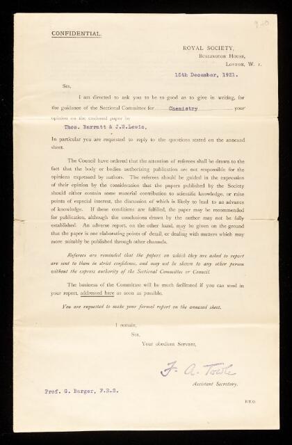 George Barger, Referee's report by George Barger, on a paper 'The heat developed by the action of caustic soda on cotton (“mercerisation”)' by Thomas Barratt and J W Lewis, 03 January 1922, RR/26/9, The Royal Society Archives, London, https://makingscience.royalsociety.org/items/rr_26_9/referees-report-by-george-barger-on-a-paper-the-heat-developed-by-the-action-of-caustic-soda-on-cotton-mercerisation-by-thomas-barratt-and-j-w-lewis, accessed on 22 January 2026