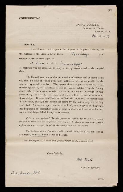 Arthur Harden, Referee's report by Arthur Harden, on a paper 'The oxidation of reduced glutathione and other sulphydryl compounds' by Malcolm Dixon and Hubert Erlin Tunnicliffe., October 1922, RR/27/39, The Royal Society Archives, London, https://makingscience.royalsociety.org/items/rr_27_39/referees-report-by-arthur-harden-on-a-paper-the-oxidation-of-reduced-glutathione-and-other-sulphydryl-compounds-by-malcolm-dixon-and-hubert-erlin-tunnicliffe, accessed on 17 January 2026