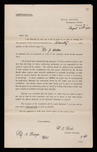 George Barger, Referee's report by George Barger, on a paper 'The periodic opacity of certain colloids in progressively increasing concentrations of electrolytes' by J Holker, 28 August 1922, RR/27/88, The Royal Society Archives, London, https://makingscience.royalsociety.org/items/rr_27_88/referees-report-by-george-barger-on-a-paper-the-periodic-opacity-of-certain-colloids-in-progressively-increasing-concentrations-of-electrolytes-by-j-holker, accessed on 10 December 2025