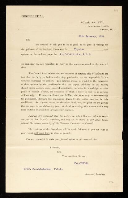 Frederick Alexander Lindemann, Referee's report by Frederick Alexander Lindemann, Viscount Cherwell, on a paper 'The constitution of the secondary spectrum of hydrogen' by William Mitchinson Hicks, February 1924, RR/28/104, The Royal Society Archives, London, https://makingscience.royalsociety.org/items/rr_28_104/referees-report-by-frederick-alexander-lindemann-viscount-cherwell-on-a-paper-the-constitution-of-the-secondary-spectrum-of-hydrogen-by-william-mitchinson-hicks, accessed on 07 December 2025