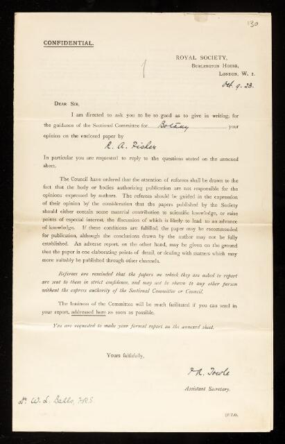 William Lawrence Balls, Referee's report by William Lawrence Balls, on a paper 'The influence of rainfall on the yield of wheat at Rothamsted' by Ronald Aylmer Fisher, October 1923, RR/28/130, The Royal Society Archives, London, https://makingscience.royalsociety.org/items/rr_28_130/referees-report-by-william-lawrence-balls-on-a-paper-the-influence-of-rainfall-on-the-yield-of-wheat-at-rothamsted-by-ronald-aylmer-fisher, accessed on 07 February 2026