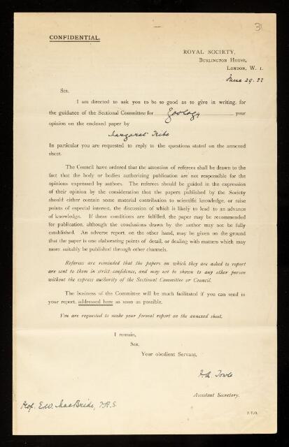 Ernest William MacBride, Referee's report by Ernest William MacBride, on a paper 'The development of the hepatic venous system and the postcaval vein in the marsupialia' by Margaret Tribe, July 1922, RR/28/31, The Royal Society Archives, London, https://makingscience.royalsociety.org/items/rr_28_31/referees-report-by-ernest-william-macbride-on-a-paper-the-development-of-the-hepatic-venous-system-and-the-postcaval-vein-in-the-marsupialia-by-margaret-tribe, accessed on 13 February 2026