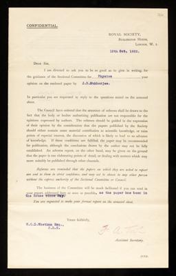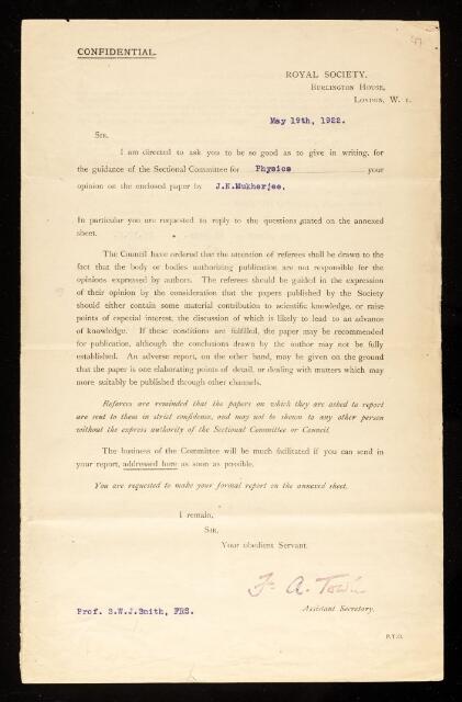 Samuel Walter Johnson Smith, Referee's report by Samuel Walter Johnson Smith, on a paper 'Sources of error in the measurement of the electrical charge of colloidal particles by the method of moving boundaries: an improved method based on a direct measurement of the potential gradient across the boundary' by Jnanendra Nath Mukherjee, September 1922, RR/28/47, The Royal Society Archives, London, https://makingscience.royalsociety.org/items/rr_28_47/referees-report-by-samuel-walter-johnson-smith-on-a-paper-sources-of-error-in-the-measurement-of-the-electrical-charge-of-colloidal-particles-by-the-method-of-moving-boundaries-an-improved-method-based-on-a-direct-measurement-of-the-potential-gradient-across-the-boundary-by-jnanendra-nath-mukherjee, accessed on 09 February 2026