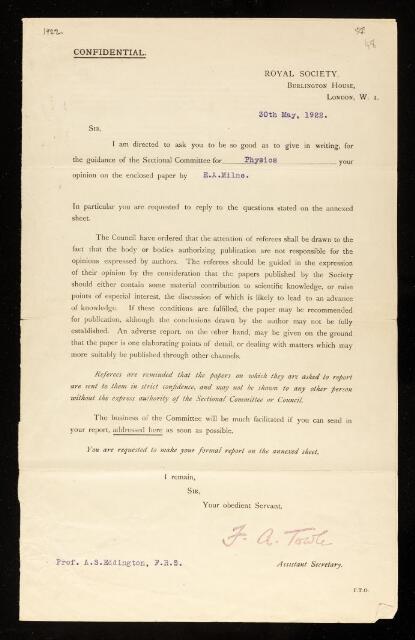 Arthur Stanley Eddington, Referee's report by Arthur Stanley Eddington, on a paper 'Radiative equilibrium: the relation between the spectral energy curve of a star and the law of darkening of the disc towards the limb, special reference to the effects of scattering and the solar spectrum' by Edward Arthur Milne, June 1922, RR/28/48, The Royal Society Archives, London, https://makingscience.royalsociety.org/items/rr_28_48/referees-report-by-arthur-stanley-eddington-on-a-paper-radiative-equilibrium-the-relation-between-the-spectral-energy-curve-of-a-star-and-the-law-of-darkening-of-the-disc-towards-the-limb-special-reference-to-the-effects-of-scattering-and-the-solar-spectrum-by-edward-arthur-milne, accessed on 11 November 2025