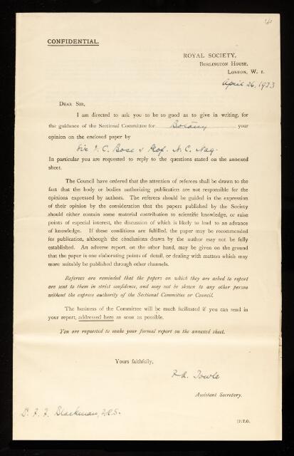 Frederick Frost Blackman, Referee's report by Frederick Frost Blackman, on a paper 'New method for accurate determination of photosynthetic desposit of carbohydrates in living plants' by Jagadis Chunder Bose and N C Naq, 23 June 1923, RR/28/66, The Royal Society Archives, London, https://makingscience.royalsociety.org/items/rr_28_66/referees-report-by-frederick-frost-blackman-on-a-paper-new-method-for-accurate-determination-of-photosynthetic-desposit-of-carbohydrates-in-living-plants-by-jagadis-chunder-bose-and-n-c-naq, accessed on 10 February 2026