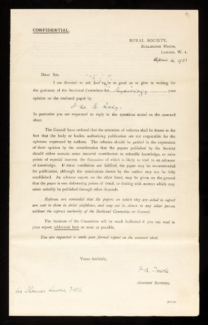 Thomas Lewis, Referee's report by Thomas Lewis, on a paper 'The influence of mechanical conditions of the circulation on the electrocardiogram' by Ivan de Burgh Daly, April 1923, RR/28/91, The Royal Society Archives, London, https://makingscience.royalsociety.org/items/rr_28_91/referees-report-by-thomas-lewis-on-a-paper-the-influence-of-mechanical-conditions-of-the-circulation-on-the-electrocardiogram-by-ivan-de-burgh-daly, accessed on 17 February 2026