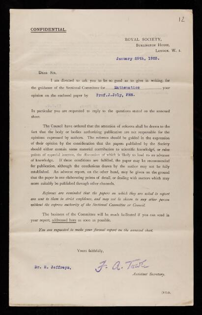 Harold Jeffreys, Referee's report by Harold Jeffreys, on a paper 'A general theory of the movements of the earth's crust' by John Joly, January 1923, RR/29/12, The Royal Society Archives, London, https://makingscience.royalsociety.org/items/rr_29_12/referees-report-by-harold-jeffreys-on-a-paper-a-general-theory-of-the-movements-of-the-earths-crust-by-john-joly, accessed on 10 November 2025