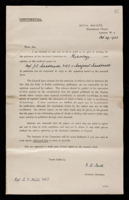 Archibald Vivian Hill, Referee's report by Archibald Vivian Hill, on a paper 'Heat production or cost of walking' by J S MacDonald and Margaret MacDonald, November 1923, RR/29/25, The Royal Society Archives, London, https://makingscience.royalsociety.org/items/rr_29_25/referees-report-by-archibald-vivian-hill-on-a-paper-heat-production-or-cost-of-walking-by-j-s-macdonald-and-margaret-macdonald, accessed on 11 November 2025
