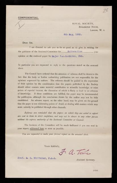 Edmund Taylor Whittaker, Referee's report by Edmund Taylor Whitaker, on a paper 'On a class of transcendents of which the bessel functions are a particular case' by Percy Alexander MacMahon, June 1923, RR/29/26, The Royal Society Archives, London, https://makingscience.royalsociety.org/items/rr_29_26/referees-report-by-edmund-taylor-whitaker-on-a-paper-on-a-class-of-transcendents-of-which-the-bessel-functions-are-a-particular-case-by-percy-alexander-macmahon, accessed on 16 November 2025