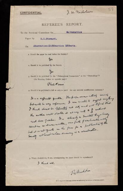 John William Nicholson, Referee's report by John William Nicholson, on a paper 'Aberration diffraction effects' by G C Steward, January 1923, RR/29/57, The Royal Society Archives, London, https://makingscience.royalsociety.org/items/rr_29_57/referees-report-by-john-william-nicholson-on-a-paper-aberration-diffraction-effects-by-g-c-steward, accessed on 11 November 2025