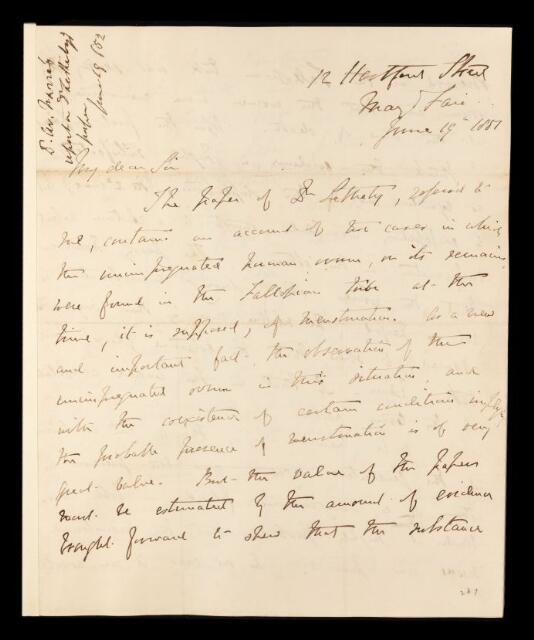 Arthur Farre, Referee's report by Arthur Farre, on a paper 'An account of two cases, in which ovules, or their remains, were discovered in the fallopian tubes of unimpregnated women who had died during the period of menstruation' by H Letheby, 19 June 1851, RR/2/135, The Royal Society Archives, London, https://makingscience.royalsociety.org/items/rr_2_135/referees-report-by-arthur-farre-on-a-paper-an-account-of-two-cases-in-which-ovules-or-their-remains-were-discovered-in-the-fallopian-tubes-of-unimpregnated-women-who-had-died-during-the-period-of-menstruation-by-h-letheby, accessed on 09 December 2025