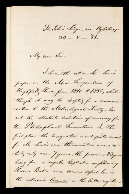 William Henry Smyth, Referee's report by William Henry Smyth, on a paper 'On the mean temperature of the observatory at Highfield House, near Nottingham, from the year 1810 to 1850' by Edward Joseph Lowe, 30 August 1851, RR/2/138, The Royal Society Archives, London, https://makingscience.royalsociety.org/items/rr_2_138/referees-report-by-william-henry-smyth-on-a-paper-on-the-mean-temperature-of-the-observatory-at-highfield-house-near-nottingham-from-the-year-1810-to-1850-by-edward-joseph-lowe, accessed on 16 February 2026