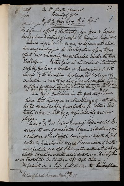 Michael Faraday, Referee's report by Michael Faraday, on a paper 'On the electro-chemical polarity of gases' by William Robert Grove, 10 April 1852, RR/2/83, The Royal Society Archives, London, https://makingscience.royalsociety.org/items/rr_2_83/referees-report-by-michael-faraday-on-a-paper-on-the-electro-chemical-polarity-of-gases-by-william-robert-grove, accessed on 16 March 2026