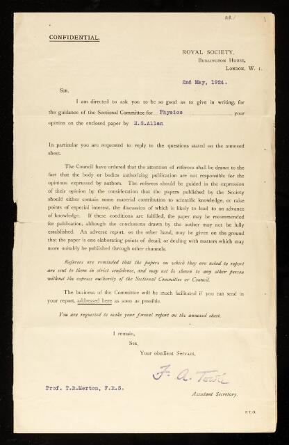 Thomas Ralph Merton, Referee's report by Thomas Ralph Merton, on a paper 'The band spectrum of hydrogen' by Herbert Stanley Allen, May 1924, RR/30/1, The Royal Society Archives, London, https://makingscience.royalsociety.org/items/rr_30_1/referees-report-by-thomas-ralph-merton-on-a-paper-the-band-spectrum-of-hydrogen-by-herbert-stanley-allen, accessed on 10 April 2026
