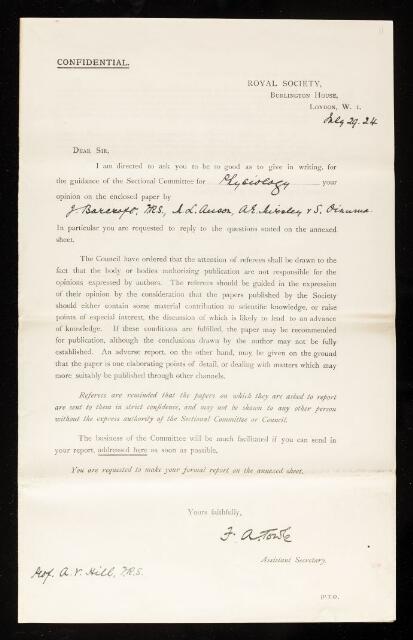 Archibald Vivian Hill, Referee's report by Archibald Vivian Hill, on a paper 'On the correlation between the spectra of various hæmoglobins and their relative affinities for oxygen and carbon monoxide' by M L Anson, Joseph Barcroft, A E Mirsky and S Oinuma, 1924, RR/30/11, The Royal Society Archives, London, https://makingscience.royalsociety.org/items/rr_30_11/referees-report-by-archibald-vivian-hill-on-a-paper-on-the-correlation-between-the-spectra-of-various-hæmoglobins-and-their-relative-affinities-for-oxygen-and-carbon-monoxide-by-m-l-anson-joseph-barcroft-a-e-mirsky-and-s-oinuma, accessed on 12 January 2026