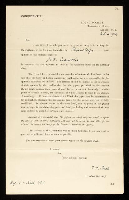 Archibald Vivian Hill, Referee's report by Archibald Vivian Hill, on a paper 'Some considerations relative to the action of X-rays on tissue cells' by [Jeffrey] A Crowther, February 1924, RR/30/33, The Royal Society Archives, London, https://makingscience.royalsociety.org/items/rr_30_33/referees-report-by-archibald-vivian-hill-on-a-paper-some-considerations-relative-to-the-action-of-x-rays-on-tissue-cells-by-jeffrey-a-crowther, accessed on 12 November 2025