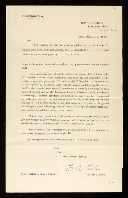 Henry Richardson Procter, Referee's report by Henry Richardson Procter, on a paper 'The discontinuity of the drying process' by E A Fisher, February 1924, RR/30/47, The Royal Society Archives, London, https://makingscience.royalsociety.org/items/rr_30_47/referees-report-by-henry-richardson-procter-on-a-paper-the-discontinuity-of-the-drying-process-by-e-a-fisher, accessed on 13 November 2025