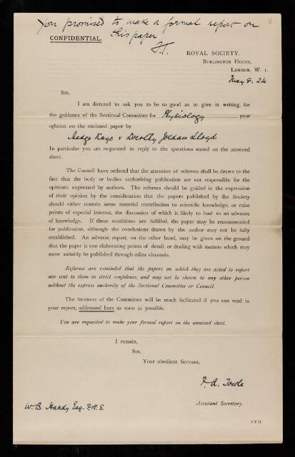 William Bate Hardy, Referee's report by William Bate Hardy, on a paper 'A histological and physico-chemical investigation of the swelling of a fibrous tissue' by Madge Kaye and Dorothy Jordan Lloyd, 1924, RR/31/8, The Royal Society Archives, London, https://makingscience.royalsociety.org/items/rr_31_8/referees-report-by-william-bate-hardy-on-a-paper-a-histological-and-physico-chemical-investigation-of-the-swelling-of-a-fibrous-tissue-by-madge-kaye-and-dorothy-jordan-lloyd, accessed on 12 April 2026