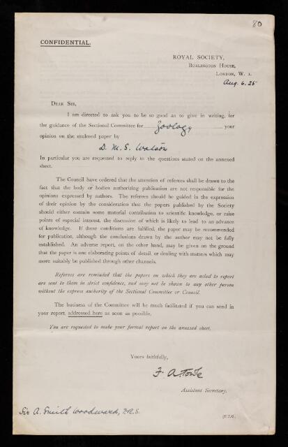 Arthur Smith Woodward, Referee's report by Arthur Smith Woodward, on the Croonian Lecture 'The evolution and origin of the amphibia' by David Meredith Seares Watson, September 1925, RR/31/80, The Royal Society Archives, London, https://makingscience.royalsociety.org/items/rr_31_80/referees-report-by-arthur-smith-woodward-on-the-croonian-lecture-the-evolution-and-origin-of-the-amphibia-by-david-meredith-seares-watson, accessed on 11 November 2025