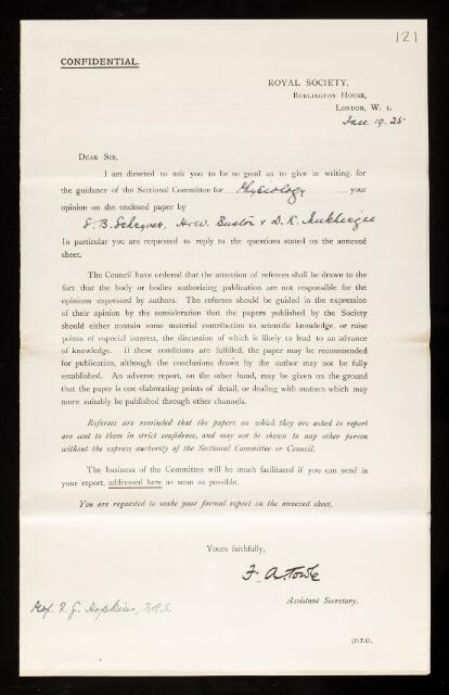 Frederick Gowland Hopkins, Referee's report by Frederick Gowland Hopkins, on a paper 'The isolation of a product of hydrolysis of the proteins hitherto undescribed' by Samuel Barnett Schryver, H W Buston and D H Mukherjee, January 1925, RR/32/121, The Royal Society Archives, London, https://makingscience.royalsociety.org/items/rr_32_121/referees-report-by-frederick-gowland-hopkins-on-a-paper-the-isolation-of-a-product-of-hydrolysis-of-the-proteins-hitherto-undescribed-by-samuel-barnett-schryver-h-w-buston-and-d-h-mukherjee, accessed on 15 December 2025