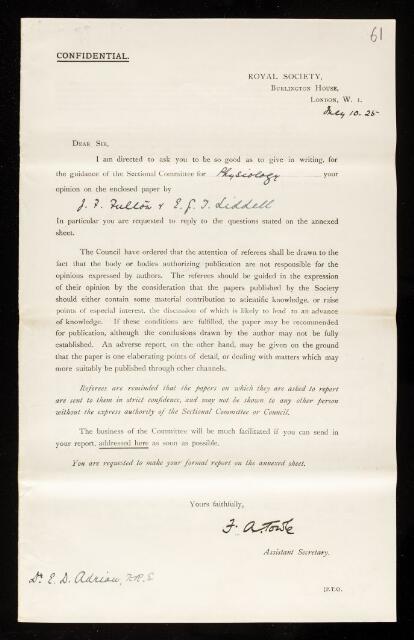 Edgar Douglas Adrian, Referee's report by Edgar Douglas Adrian, on a paper 'Electrical responses of extensor muscles during postural (myotatic) contraction' by J F Fulton and Edward George Tandy Liddell, 07 August 1925, RR/32/61, The Royal Society Archives, London, https://makingscience.royalsociety.org/items/rr_32_61/referees-report-by-edgar-douglas-adrian-on-a-paper-electrical-responses-of-extensor-muscles-during-postural-myotatic-contraction-by-j-f-fulton-and-edward-george-tandy-liddell, accessed on 12 November 2025