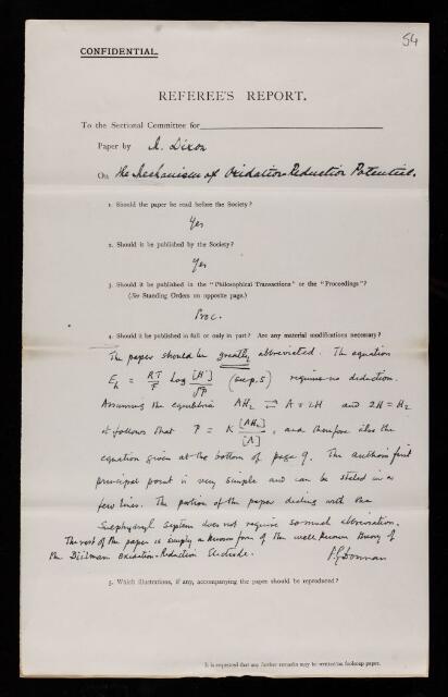 Frederick George Donnan, Referee's report by Frederick George Donnan, on a paper 'On the mechanism of oxidation-reduction potential' by Malcolm Dixon, July 1926, RR/33/54, The Royal Society Archives, London, https://makingscience.royalsociety.org/items/rr_33_54/referees-report-by-frederick-george-donnan-on-a-paper-on-the-mechanism-of-oxidation-reduction-potential-by-malcolm-dixon, accessed on 13 January 2026