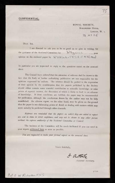 Owen Willans Richardson, Referee's report by Owen Willans Richardson, on a paper 'On the rate of maximum activation by collision for complex molecules with applications to velocities of gas reactions' by Ralph Howard Fowler and Eric Keightley Rideal, November 1926, RR/33/75, The Royal Society Archives, London, https://makingscience.royalsociety.org/items/rr_33_75/referees-report-by-owen-willans-richardson-on-a-paper-on-the-rate-of-maximum-activation-by-collision-for-complex-molecules-with-applications-to-velocities-of-gas-reactions-by-ralph-howard-fowler-and-eric-keightley-rideal, accessed on 08 February 2026