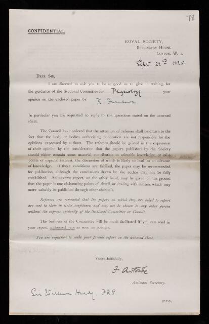 William Bate Hardy, Referee's report by William Bate Hardy, on a paper 'A spirometer method of studying continuously the gaseous metabolism of man during and after exercise' by K Furusawa, September 1925, RR/33/78, The Royal Society Archives, London, https://makingscience.royalsociety.org/items/rr_33_78/referees-report-by-william-bate-hardy-on-a-paper-a-spirometer-method-of-studying-continuously-the-gaseous-metabolism-of-man-during-and-after-exercise-by-k-furusawa, accessed on 15 March 2026
