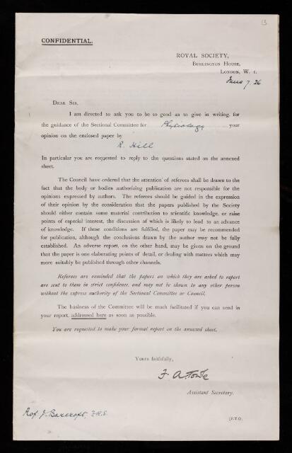Joseph Barcroft, Referee's report by Joseph Barcroft, on a paper 'The chemical nature of haemochromogen and its carbon monoxide compound' by R Hill, November 1926, RR/34/13, The Royal Society Archives, London, https://makingscience.royalsociety.org/items/rr_34_13/referees-report-by-joseph-barcroft-on-a-paper-the-chemical-nature-of-haemochromogen-and-its-carbon-monoxide-compound-by-r-hill, accessed on 06 December 2025