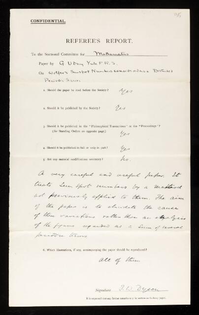 Referee's report by Frank Watson Dyson, on a paper 'On a method of investigating periodicities disturbed series, with special reference to Wolfer's sunspot numbers' by George Udny Yule