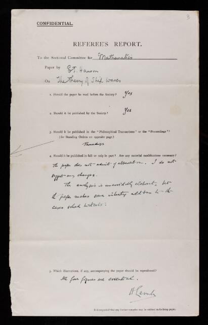 Horace Lamb, Referee's report by Horace Lamb, on a paper 'The theory of ship waves' by E T Hanson, March 1926, RR/34/3, The Royal Society Archives, London, https://makingscience.royalsociety.org/items/rr_34_3/referees-report-by-horace-lamb-on-a-paper-the-theory-of-ship-waves-by-e-t-hanson, accessed on 19 April 2026