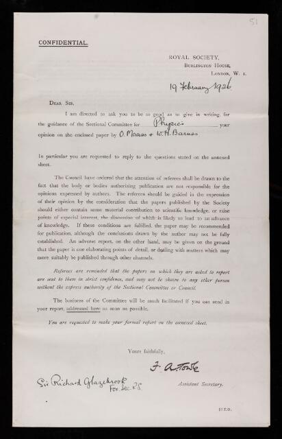 Richard Tetley Glazebrook, Referee's report by Richard Tetley Glazebrook, on a paper 'Some thermal constants of solid and liquid carbon dioxide' by Otto Maass and W H Barnes, 08 March 1926, RR/34/51, The Royal Society Archives, London, https://makingscience.royalsociety.org/items/rr_34_51/referees-report-by-richard-tetley-glazebrook-on-a-paper-some-thermal-constants-of-solid-and-liquid-carbon-dioxide-by-otto-maass-and-w-h-barnes, accessed on 18 January 2026