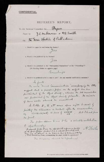 Alfred Fowler, Referee's report by Alfred Fowler, on a paper 'On the series spectra of palladium' by John Cunningham McLennan and H Grayson Smith, 1926, RR/34/61, The Royal Society Archives, London, https://makingscience.royalsociety.org/items/rr_34_61/referees-report-by-alfred-fowler-on-a-paper-on-the-series-spectra-of-palladium-by-john-cunningham-mclennan-and-h-grayson-smith, accessed on 20 April 2026