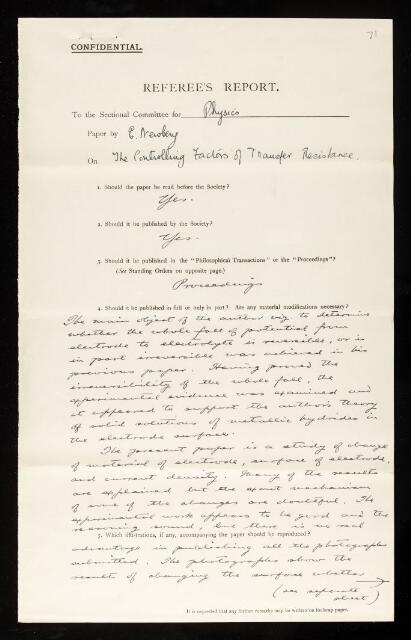 Frank Edward Smith, Referee's report by Frank Edward Smith, on a paper 'The controlling factors of transfer resistance' by Edgar Newbery, 28 January 1926, RR/34/71, The Royal Society Archives, London, https://makingscience.royalsociety.org/items/rr_34_71/referees-report-by-frank-edward-smith-on-a-paper-the-controlling-factors-of-transfer-resistance-by-edgar-newbery, accessed on 14 November 2025