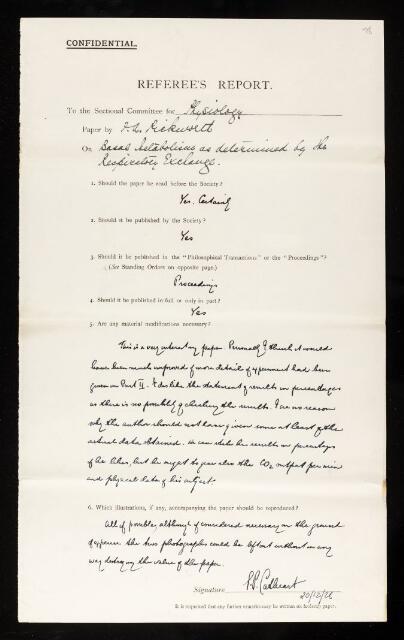 Referees' reports on scientific papers submitted to the Royal Society for publication