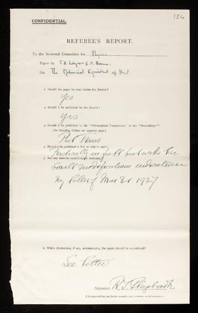 Richard Tetley Glazebrook, Referee's report by Richard Tetley Glazebrook, on a paper 'The mechanical equivalent of heat' by Thomas Howell Laby and E O Hercus, March 1927, RR/35/134, The Royal Society Archives, London, https://makingscience.royalsociety.org/items/rr_35_134/referees-report-by-richard-tetley-glazebrook-on-a-paper-the-mechanical-equivalent-of-heat-by-thomas-howell-laby-and-e-o-hercus, accessed on 13 December 2025